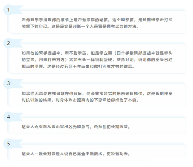 用传统武术的标准,判断一个人是否练家子(也就是练习武术硬功和格斗),主要看几点: