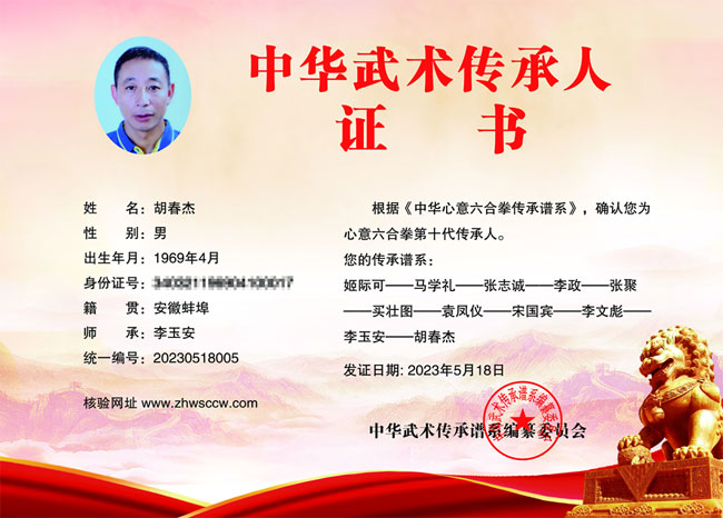 胡春杰:男,1969年4月出生,汉族,中共党员,大专文化,系心意六合拳第十代传承人。自幼喜欢武术,中学时代曾经自学过少林小洪拳。1986年至1991年在部队练习军体拳并担任过军体拳教练。1992年在怀远县公安局防暴队练习擒敌拳、警体拳,后拜蚌埠宋门心意六合拳总会会长李玉安师父练习心意六合拳至今。